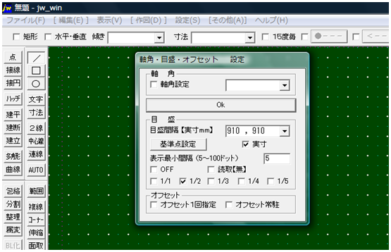 軸角・目盛・オフセット 設定から、目盛間隔を910 , 910と入力し、実寸にチェックを入れる。