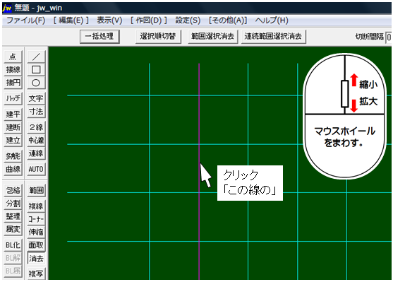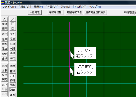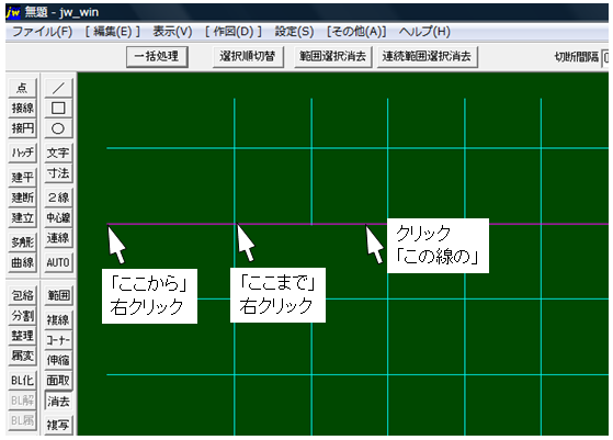 はみ出た部分も、端点、交点に合わせて部分消去するときは、右クリック。