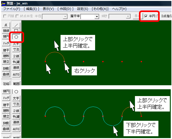 円コマンドクリック、半円にチェックを入れる。1つ目の点2つ目の点を右クリックする。→上半円は上部で下半円は下部でクリックすると描けます。
