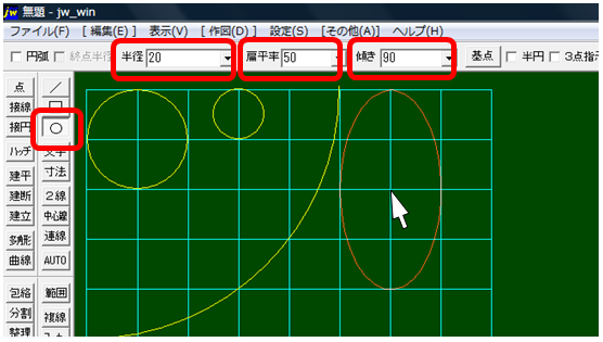 円コマンド、半径20、扁平率50、傾き90に指定します。交点で右クリック。