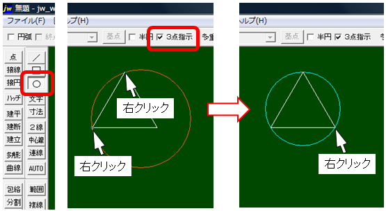 円コマンドクリック、3点指示にチェックを入れる。1つ目の点2つ目の点を右クリックする。→3つ目の点を右クリックすると3点指示の円が描けます。