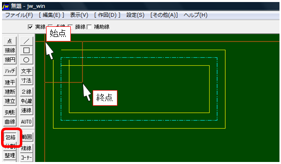 包絡コマンドを選択。範囲指定、始点クリック、終点クリック。
