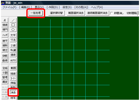 編集ツールバーの消去コマンド → 一括処理をクリック。
