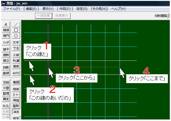 消したい線をはさむ両方の線をクリックし、消したい範囲を選択する。