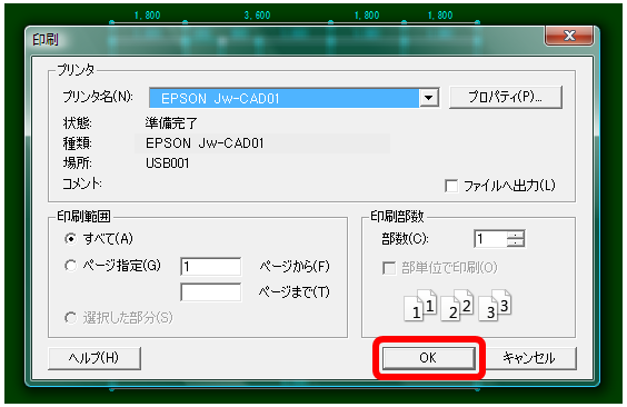 印刷設定小画面が現れたら、プロパティから印刷品質など、印刷範囲、印刷部数を指定して OK をクリックします。
