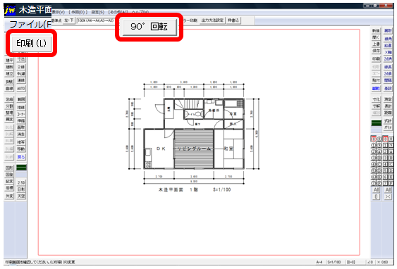 赤い用紙枠が縦方向になっていたら、90°回転で合わせましょう。