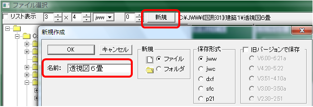 新規から名前を付ける。今回は透視図6畳。OKをクリックすると保存される。