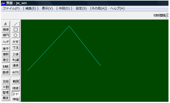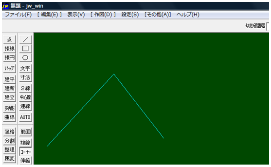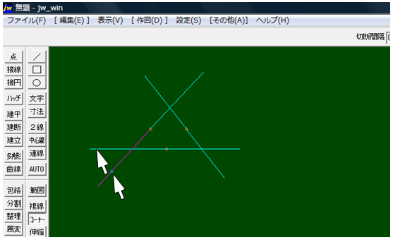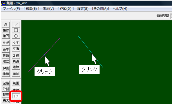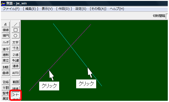 コーナー処理コマンドをクリック、1本目と2本目をクリックする。