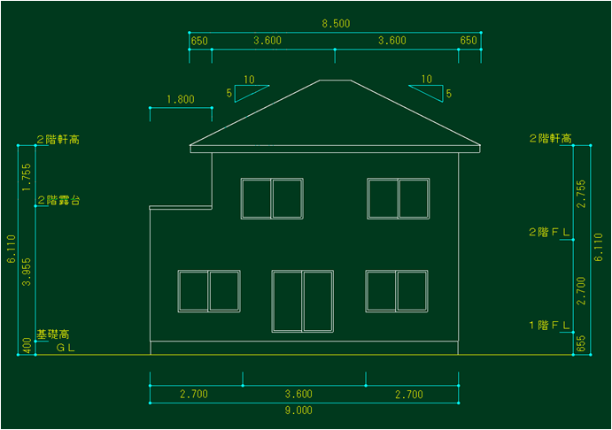 軒の出は長い目の650oとします。FLとは床の高さとなります。