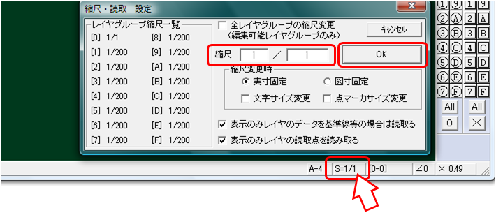 ステータスバーのスケールをクリックして、1/1に設定します。
