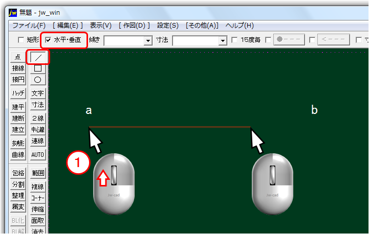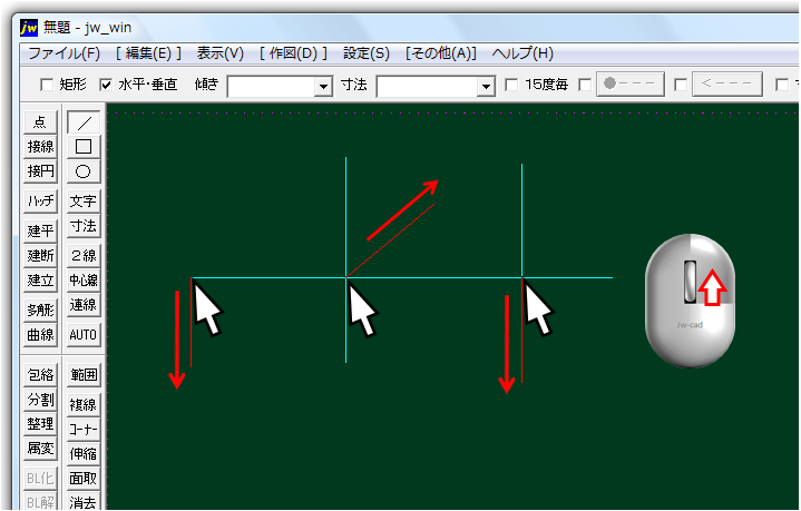 Jw-CADでは、始点クリック→終点クリックになります。