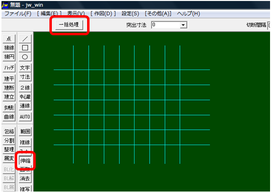 編集ツールバーから伸縮コマンドをクリック → 一括処理をクリックする。