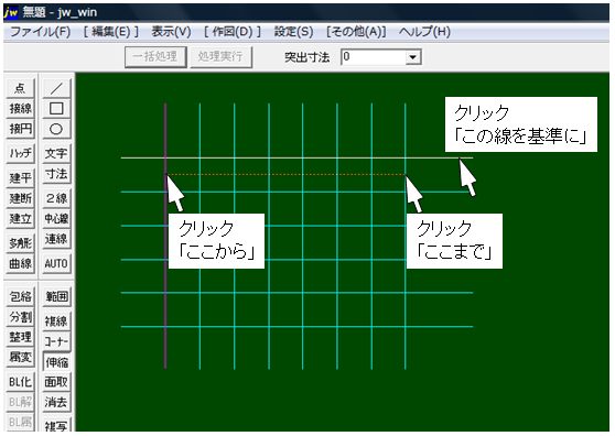 基準線をクリック → 一括処理する始点から終点を指示する。(残したい側を指示)