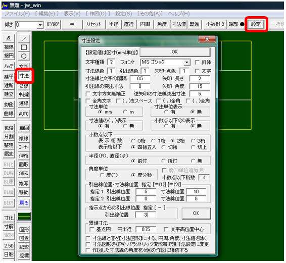 寸法コマンド→設定を指示、寸法設定小画面から寸法線色、引出し線色、フォントなど設定できる。文字種類は、数字が大きくなるほど文字も大きくなる。