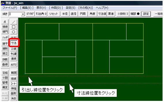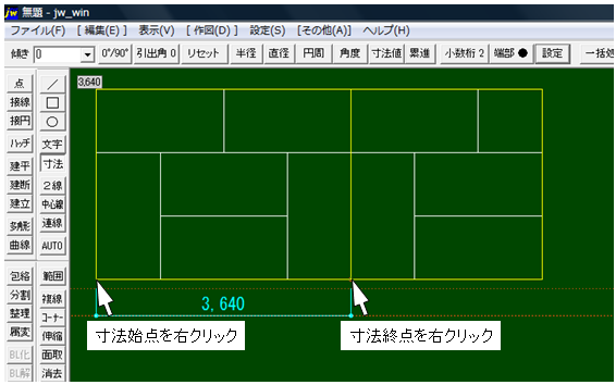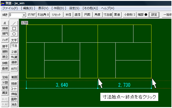 寸法を記入したい場所の始点と終点を指示する。(端点、交点は右クリック)