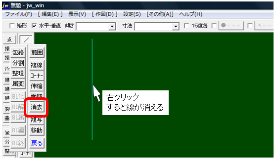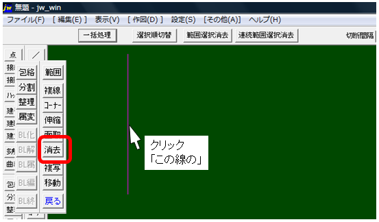 編集ツールバーから消去コマンドを選択し、部分消去したい線をクリック。