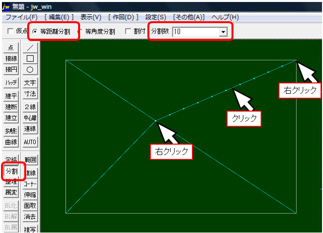 編集ツールバーより分割コマンドを選び、等距離分割で、分割数は10とする。