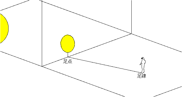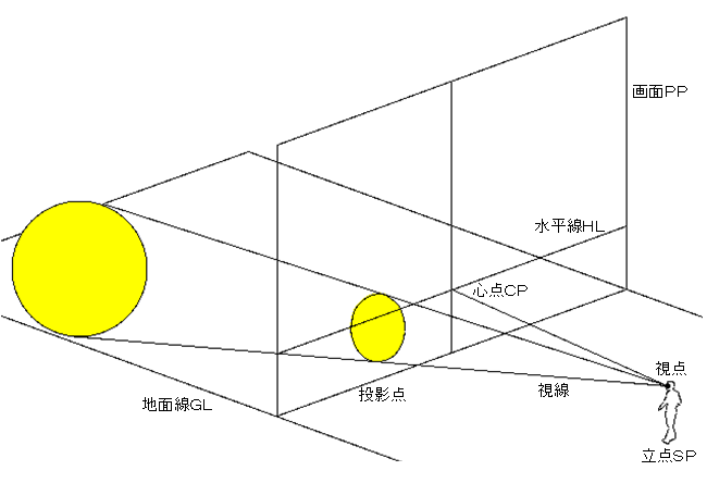 人の立っている場所が立点、人の視点から、まっすぐに画面(PP)を見た点が心点(CP)、それを横水平に引いた線が水平線(HL)。