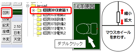 今回は、図形コマンドから《図形01》建築1の 14洋便器に、手洗いを付けてみました。