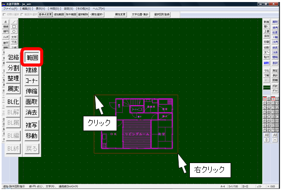 編集ツールバーの範囲コマンドを選び、文字データを含むので始点クリック、終点右クリックで範囲選択します。