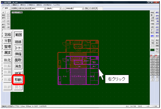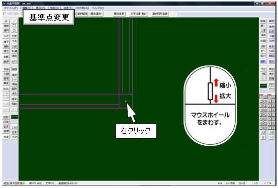 基準点変更で建物の右下部分(左下でも良い)の柱中心のグリッドに右クリックで基準点を設定します。【拡大すると正確に作業できます。】