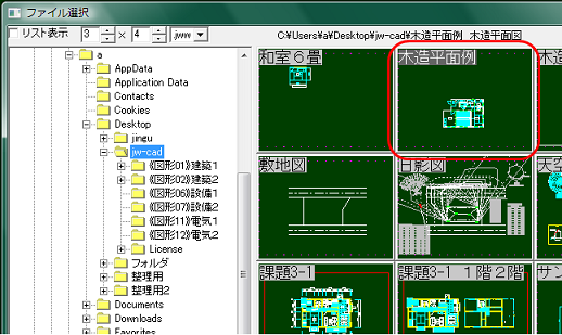 ファイル選択に、小画面が現れたら、木造平面図例をダブルクリックします。